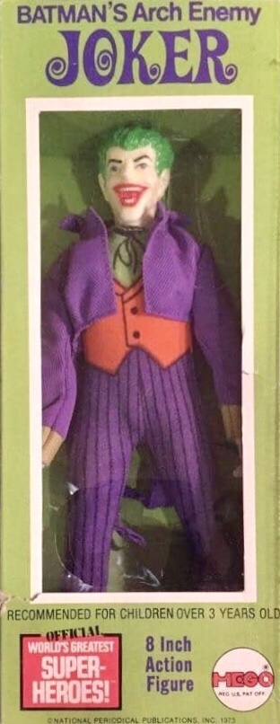 Notes: The crown prince of crime made his Mego debut in 1974 with this open boxed version. Mego later switched their packaging format to a carded blister pack from 1976 until 1980, when the WSGH line eventually came to and end. There were no variations from the Boxed to Carded versions. Joker came with his cloth outfit, Coat and Shoes. Note that Joker’s coat can be removed from the cloth outfit.