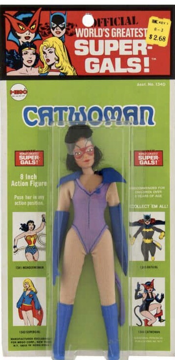Notes: Catwoman made her Mego debut in 1974 (with the rest of the “Super Gals”) with this open boxed version. Mego switched the packaging format to a carded blister pack from 1976-1979, when she was eventually removed from the WSGH lineup. There were no variations from the Boxed to Carded versions. Catwoman came with her cloth outfit (with tail), boots and gloves. Note that her mask is painted and can not be removed.