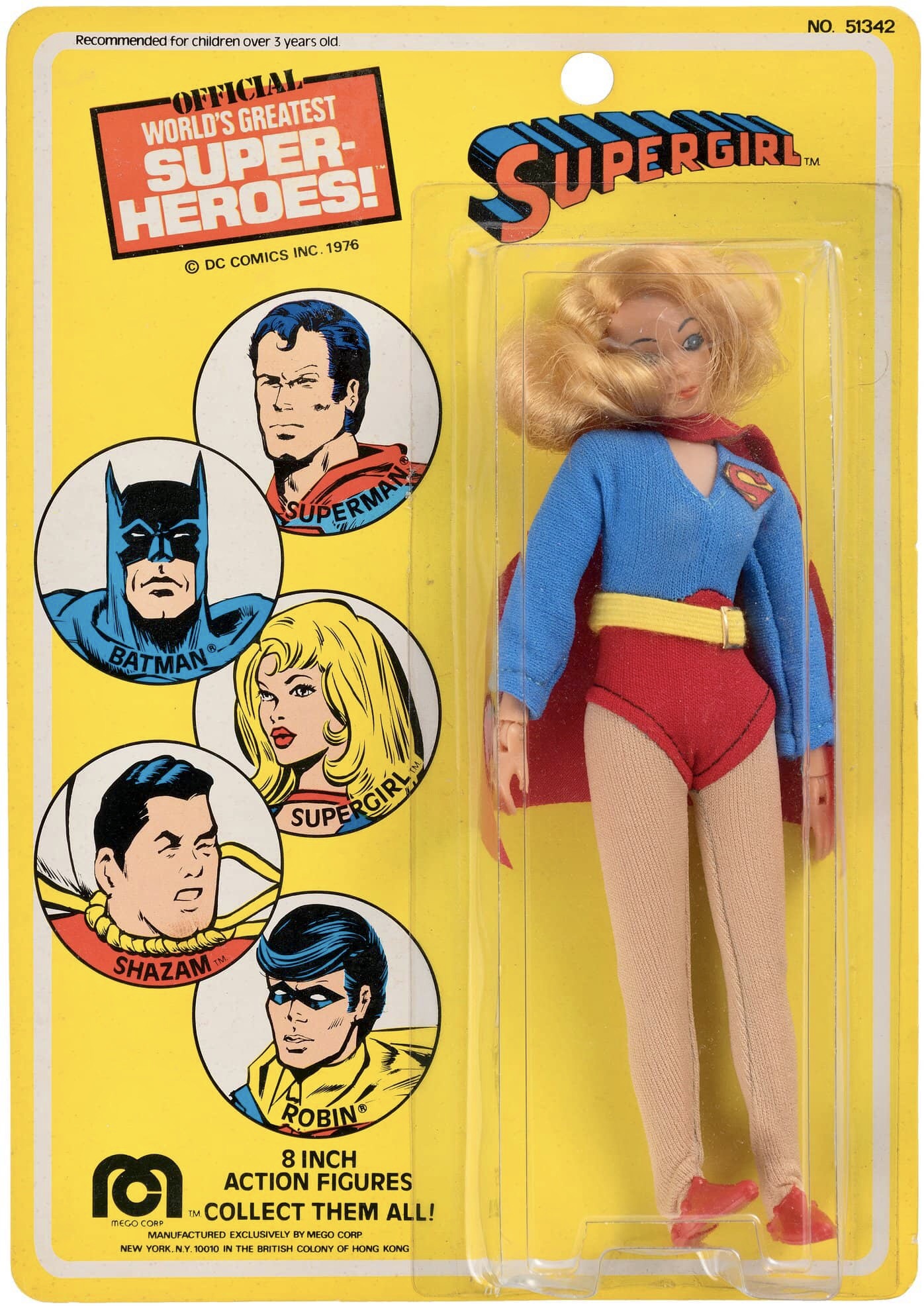 Notes: Supergirl made her Mego debut in 1974 (with the rest of the “Super Gals”) with this open boxed version. Mego switched the packaging format to a carded blister pack from 1976-1979, along with the rest of the WGSH lineup. There were no variations from the Boxed to Carded versions. Supergirl came with her cloth outfit and emblem on it, along with her belt and shoes. Note that the cape can be removed from the cloth outfit.