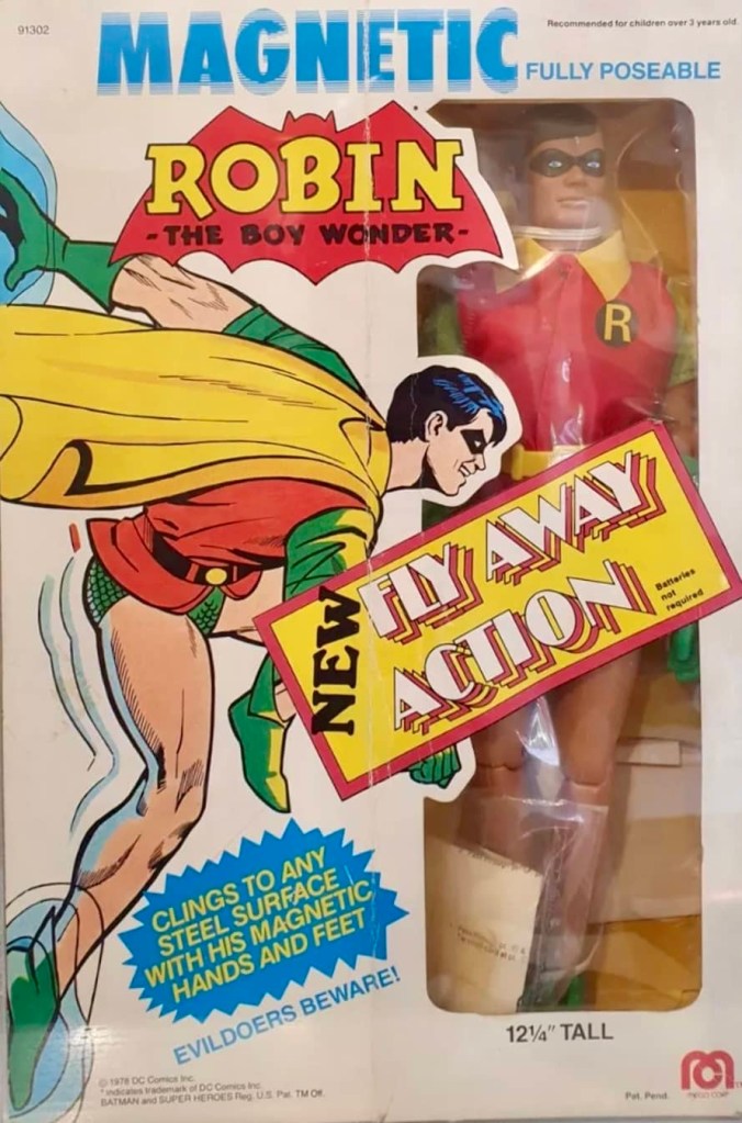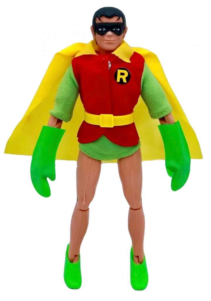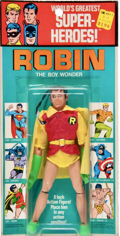 Notes: In 1973, Mego changed their packaging to an open window box version, so buyers could actually see the figure inside. The early versions still featured the removable mask, but beginning with the 1974 releases, Mego changed to a new painted on version of the mask. In 1976, Mego switched from their regular box packaging to a new carded format for their WGSH lineup. This carded version would remain in production until the line came to an end in 1980. There were no variations from this open box to the carded versions. Robin came with his cloth tunic and emblem on it, along with his shorts, belt, cape, shoes and gloves.