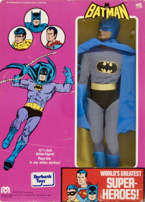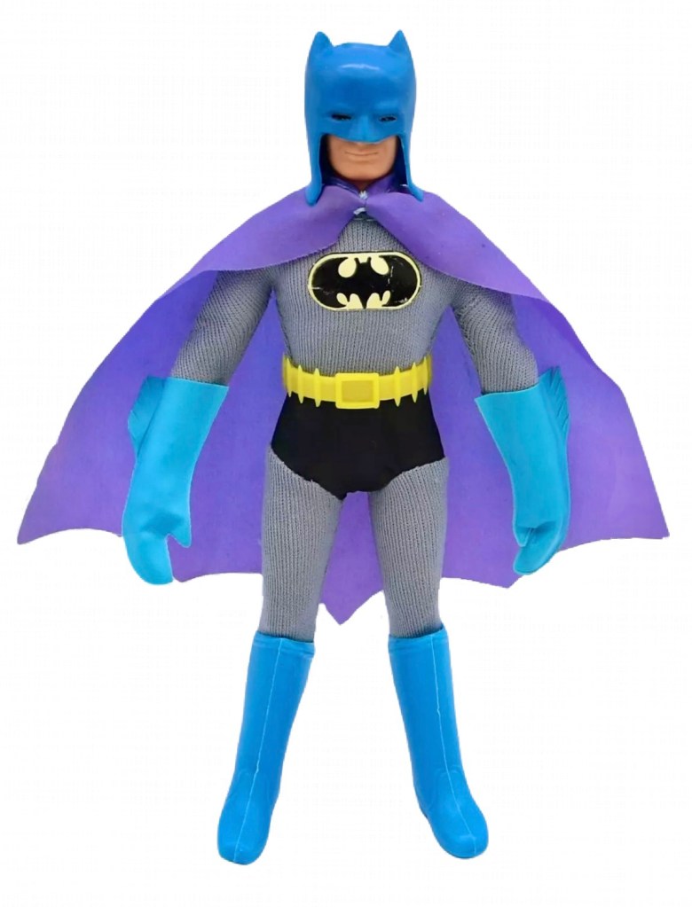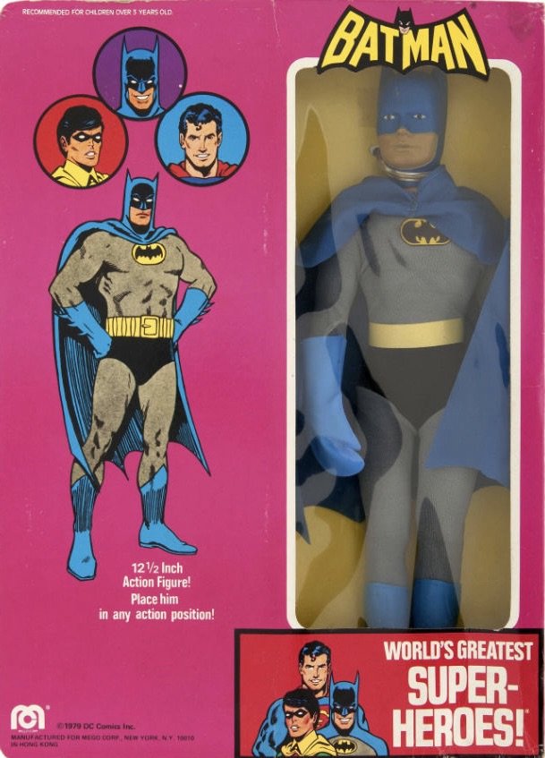 Notes: In 1973, Mego changed their packaging to an open window box version, so buyers could actually see the figure inside. The early versions still featured the removable mask, but beginning in 1974, Mego changed to a new painted on version of the mask. In 1976, Mego switched from their regular box packaging to a new carded format for their WGSH lineup. This carded version would remain in production until the line came to an end in 1980. There were no variations from this open box to the carded versions. Batman came with his cloth outfit and emblem on it, along with his belt, boots and gloves.