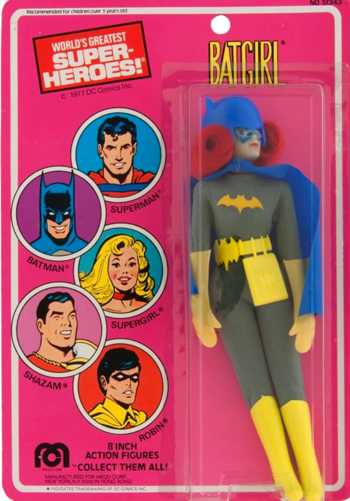 Notes: Batgirl made her Mego debut in 1974 (with the rest of the “Super Gals”) with an open boxed version. Mego switched the packaging format to a carded blister pack from 1976 until 1979, when she was eventually removed from the WGSH lineup. There were no variations from the Boxed to Carded versions. Note that her cowl is removable for all releases, but the mask underneath is painted on.
