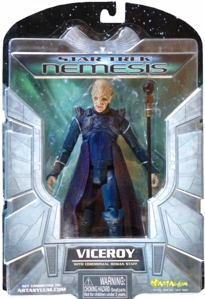 Art Asylum released a small wave of four figures from Star Trek Nemesis, which was released that same year. Featured were Captain Picard, Lt. Commander Data, Shinzon and the Reman Viceroy. A few additional figures from Nemesis would be later released in future waves of Next Generation figures.