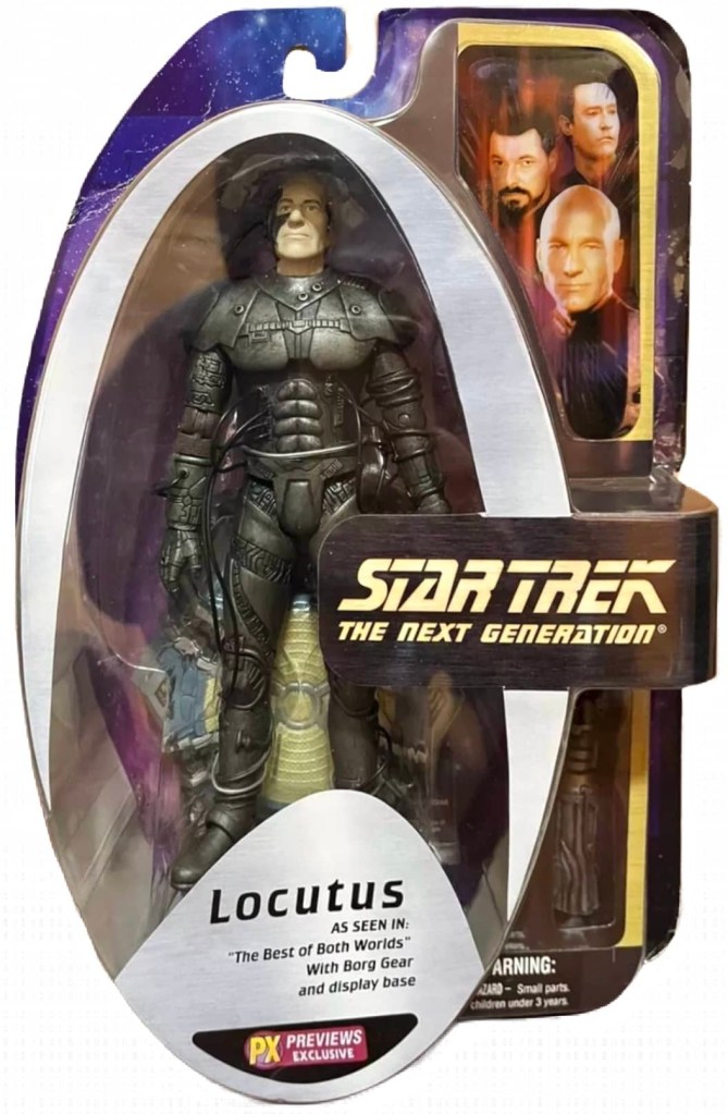 Notes: Locutus was the Borg version of Captain Picard, and features him as he appeared in the episode, “Best of Both Worlds”. The figure was available as a Previews exclusive.