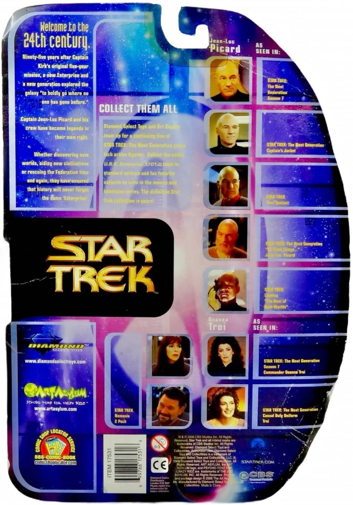 Art Asylum and Diamond Select partnered in 2006 to launch a new toy line based on Star Trek: The Next Generation. This followed suit from their Enterprise line in 2001 and The Original Series line in 2003. This Next Generation line would run through 2010, and included many classic figures and fan favorites from the Show. Like its predecessors, this Next Generation line was very well done with some fantastic sculpts and costuming. These figures remain very popular to this day with fans and collectors.