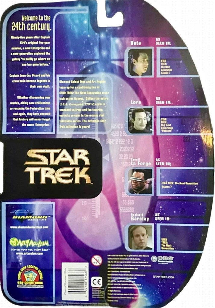 Notes: This version of Data features him from Season 7 of the Next Generation. He comes with a tricorder, cat, violin and head panel.