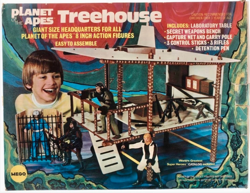 Notes: The Planet of the Apes Treehouse playset was not based on anything in particular but rather a generic playset that was modeled for the Planet of the Apes universe. It is actually a re-branded Jungle Treehouse from the Action Jackson line that was released in 1972. A gift set was released as well that included the Treehouse and all five of the Series 1 figures in plastic baggies. The gift set is a coveted item and difficult to find in box on the secondary market.