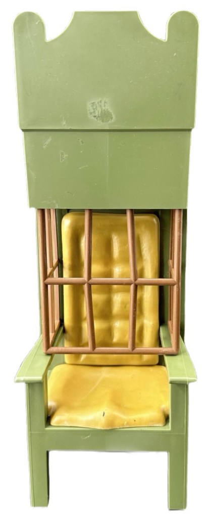 Notes: The premise for the Throne was extremely simple. The Apes would place a peanut butter sandwich on the throne, then one of the astronauts would sit down on the throne to eat it, and the apes would trigger the trap. A cage would slide down and capture him…..This was a simple but fun accessory.
