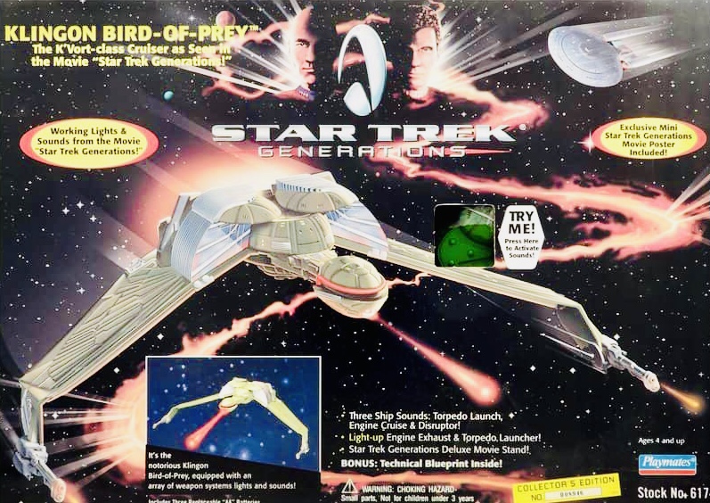Notes: This brand new version of the Klingon Bird of Prey ship comes from the movie Generations. It features light and sound like the other ships from Playmates and is limited edition.