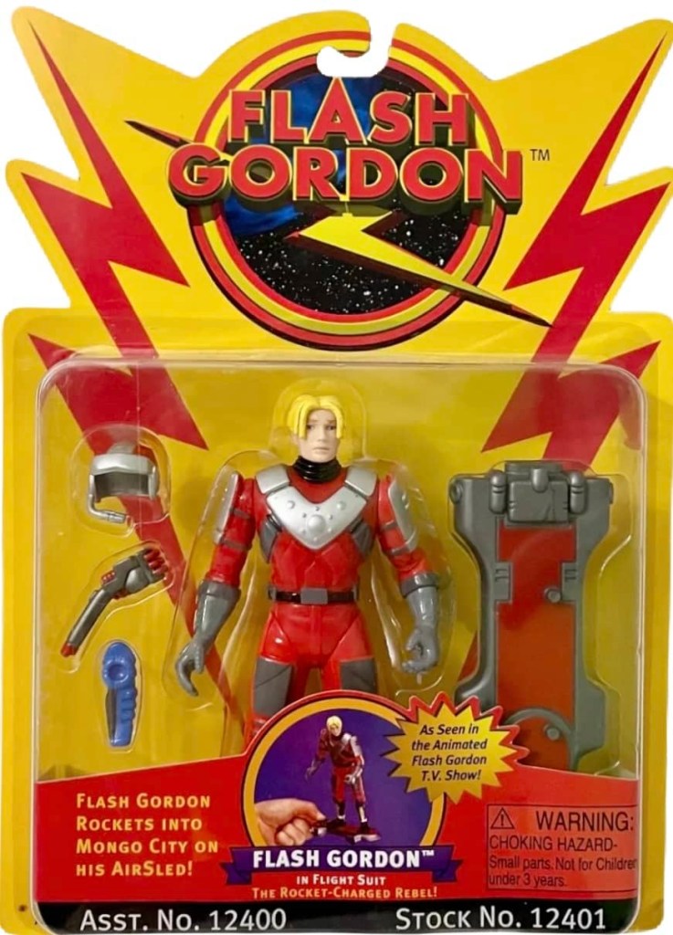 Notes: Flash Gordon is the hero and title character of the Flash Gordon animated series on 1996. Described as the ‘Rocket Charged Rebel”, Flash is ready is ready to rocket into the Mongo City on his air sled. The Flight Suit version of Flash comes with his Tri-Blaster Hand Weapon, Rebel Tran Scanner, and Rocket Rolling Air Sled.