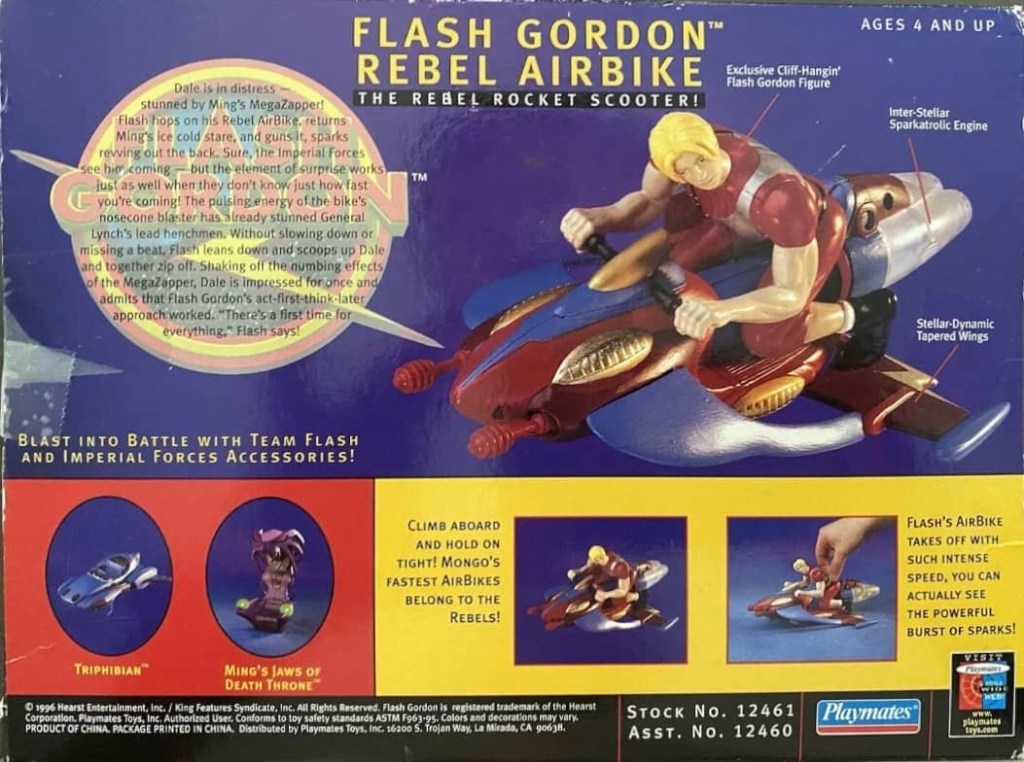 Notes: The Flash Gordon Rebel Airbike is described as “The Rebel Rocket Scooter” and carries our hero Flash into battle. The Airbike comes with Inter-Stellar Sprakatrolic Engine, Stellar-Dynamic Tapered Wings and an exclusive Cliff-Hangin’ Flash Gordon figure.