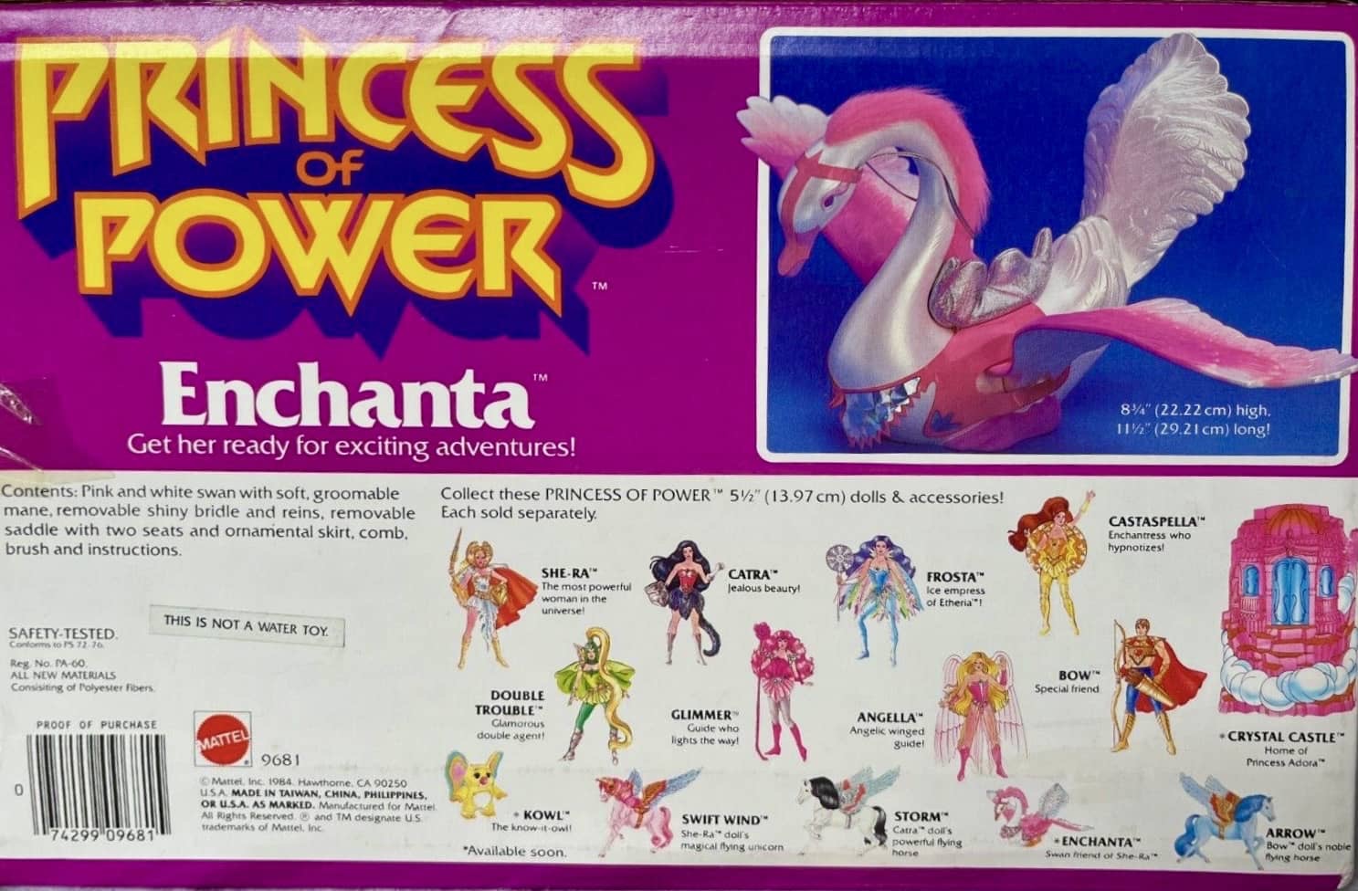 Notes: Enchanta a large flying swan, that was used as a mount for She-Ra & friends. Enchanta came with a soft mane that could be groomed like a horse, as well as removable saddle to accommodate two figures, bridle & reins, ornamental skirt, comb and brush.