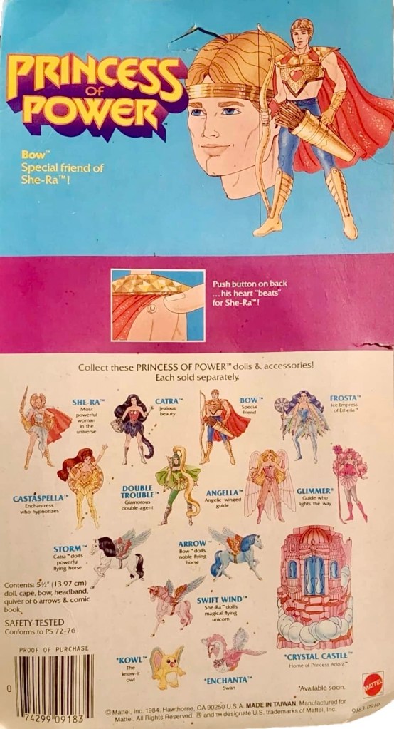 Notes: He has the distinction of being the only male figure produced in the entire line (lucky guy). Bow comes with his cape, chest armor, headband, quiver and of course, his bow.