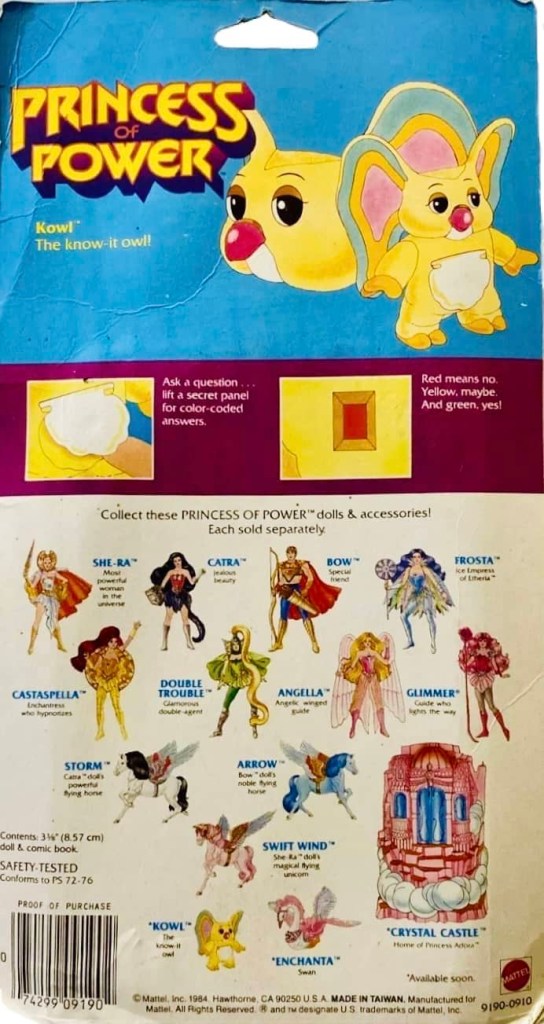Notes: Kowl is a from an unknown race of creatures mixed with Koala and Owl, hence the character’s name. Kowl acted as the “comic relief” for the series, similar to Orko in Masters of the Universe. His “unique feature” is that you ask Kowl a question, then lift the flap on his chest for the color coded answer.