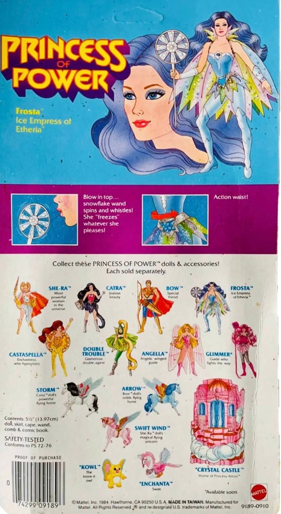 Notes: Frosta is the “Ice Empress of Etheria” and lives in Castle Chill, which sounds like a very relaxing place. Frosta comes with her Staff, Cape, Skirt, Comb, and Mini-Comic. Her staff spins when you blow on it, like a pinwheel.
