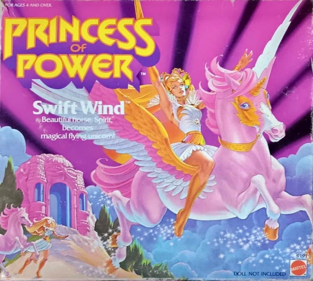 Notes: Swift Wind is the horse and trusted steed of She-Ra herself. Swifty’s alter-ego is Sprit, who changes into Swift Wind when Adora transforms to She-Ra, similar to the Cringer and Battle Cat switch. Swift Wind comes with a winged saddle, brush, comb and mini-comic.