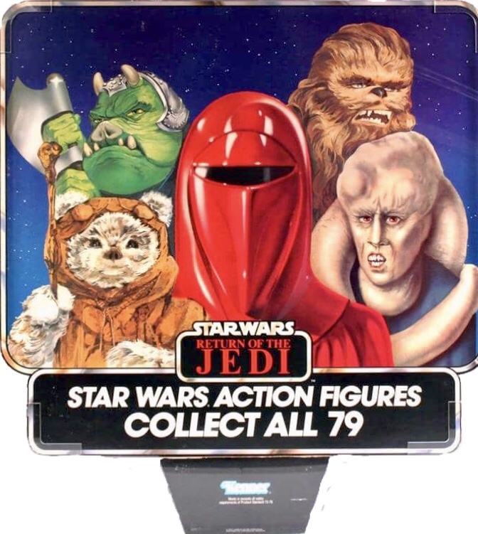 Kenner released 31 amazing figures for their Return of the Jedi line from 1983 to 1984 , along with their accessories, vehicles and playsets. This brought the total number of Star Wars figures to 79 for all three movies. Kenner did a good job of giving us new likenesses and outfits for our fan favorites, while still creating new and interesting characters to re-create our favorite movie scenes. Since the first wave of figures was released in advance of the actual movie, Lucasfilm had asked Kenner to keep the images of the Ewok figures blacked out on the figure card backs to keep their appearance a secret.