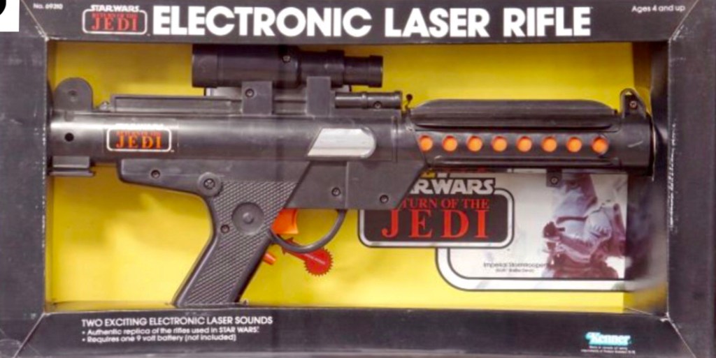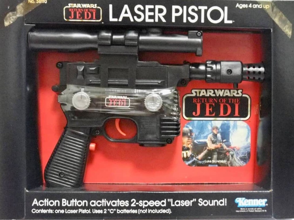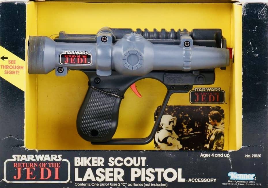Kenner released some fantastic role play weapons as part of their Star Wars line through the years. The Return of the Jedi line saw the Electronic Laser Rifle and Laser Pistol re-released with Return of the Jedi packaging, as well as a brand new Biker Scout Laser Pistol.