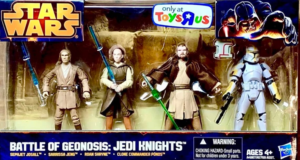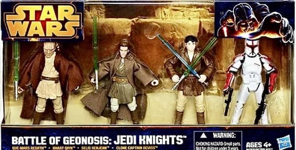 Hasbro release four different Multipacks for their Saga Legends/Mission Series line in 2013. Two of them were Darth Vader re-treads, with “The Evolution of Darth Vader” and “The Rise of Darth Vader”, and the other two actually being new assortments of characters called the “Battle of Geonosis: Jedi Knights” sets. Each set contained a clone trooper and three different Jedi Knights from the iconic Battle of Geonosis scene of Attack of the Clones.