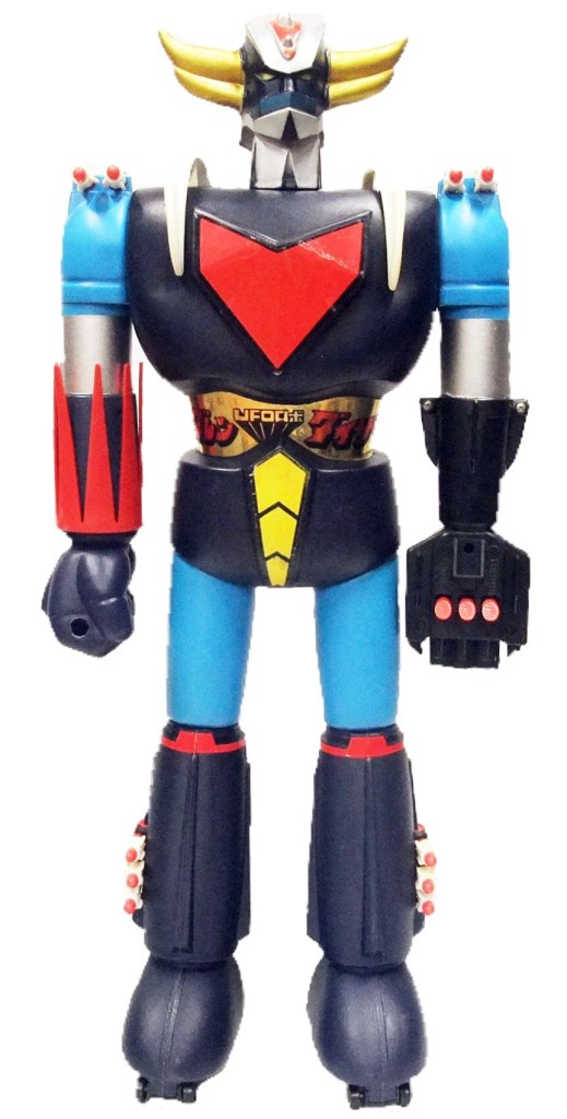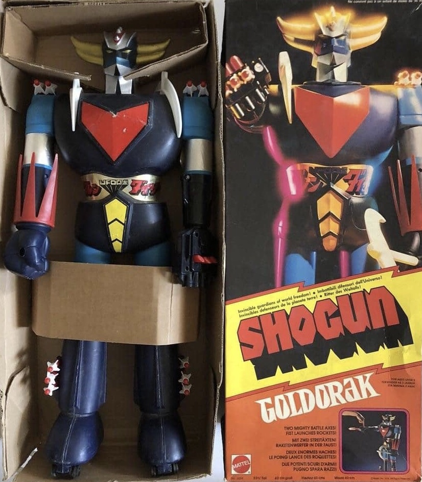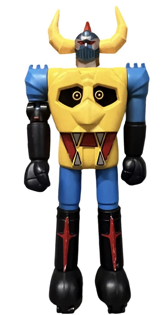 Notes: This jumbo Shogun Warrior was never released in the United States, and primarily only sold in European and Asian markets. The Italian version was named Goldrake, while the French version was named Goldorak. Many Shogun Warrior fans may know him better as Grendizer or Grandizer. His hand had the same rocket firing mechanism as Mazinga, along with the same type of rockets. His non-firing hand was able to be launched. Goldrake/Goldorak also came with two Scythes which could come together and form a larger weapon. This is considered among the tougher to find Shogun Warrior jumbo figures on the secondary market.