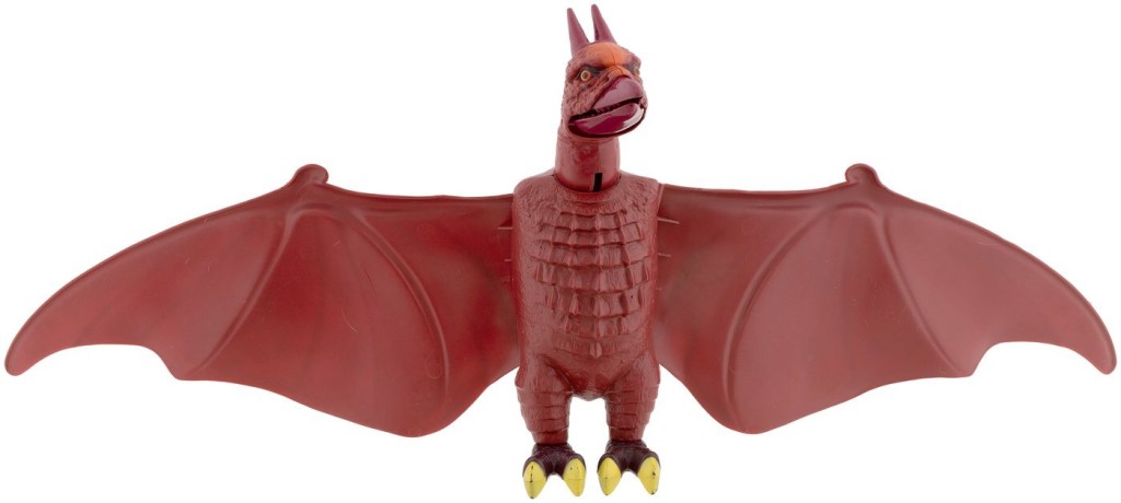 Notes: The Shogun Warriors needed enemies to battle, so Mattel came up with two amazing creatures to fit that bill. One of them was the legendary Godzilla himself! The other was his longtime adversary, Rodan. Rodan was released in 1980, and had the distinction of being the last jumbo Shogun Warrior to be released. Rodan was made in the same scale of Godzilla, making him shorter than the other robot Shogun Warriors, but he did an impressive 38″ wingspan. Rodan did not come with any gadgets or accessories, aside from his opening and closing beak when you worked the red lever on the back of head. Loose versions of Rodan are usually found with torn or broken wings, due to child wear and tear.