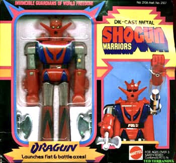 Notes: Dragun was one of the original Shogun Warriors released the year before in the jumbo version, and one of the more popular figures due to being released in other formats as well. Dragun came with his signature battle axes, and is recognizable by his bright red paint job and head spikes.