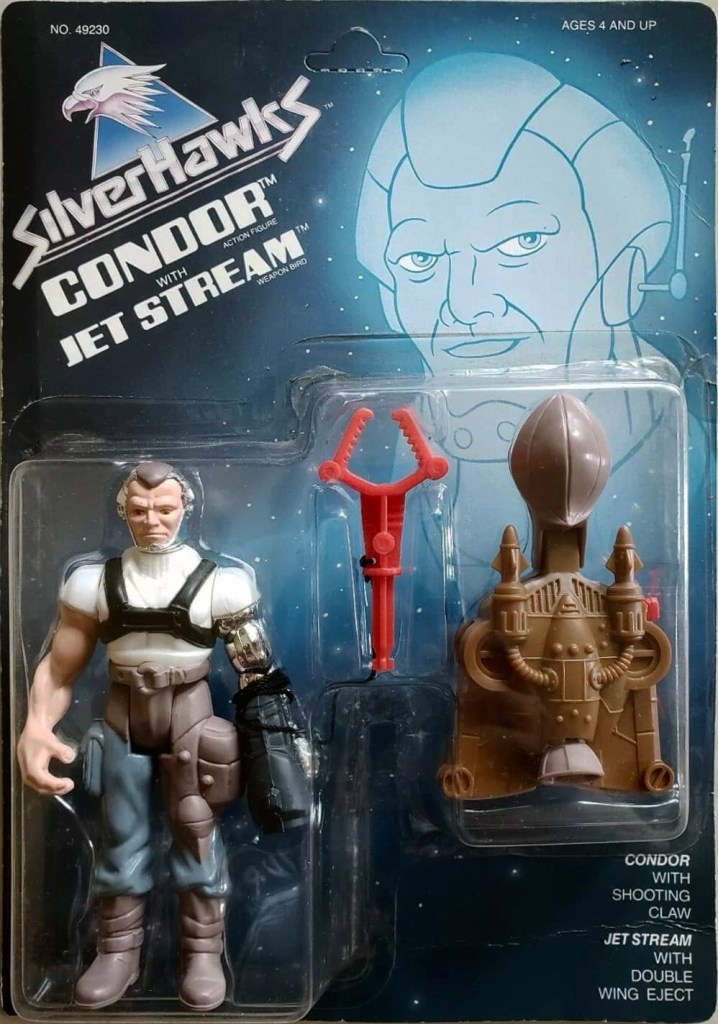 Notes: Condor comes with an action feature that fires a talon when a button is pushed under his left arm. A pin on Jet Stream fits into a hole in Condor’s back to connect. Jet Stream’s head manually pivots down to form a visor and a control lever moves to fit into Condor’s right hand. When you pull Jet Stream’s tail out, his wings go up and the tips pop out.