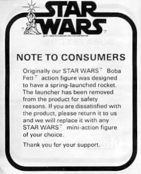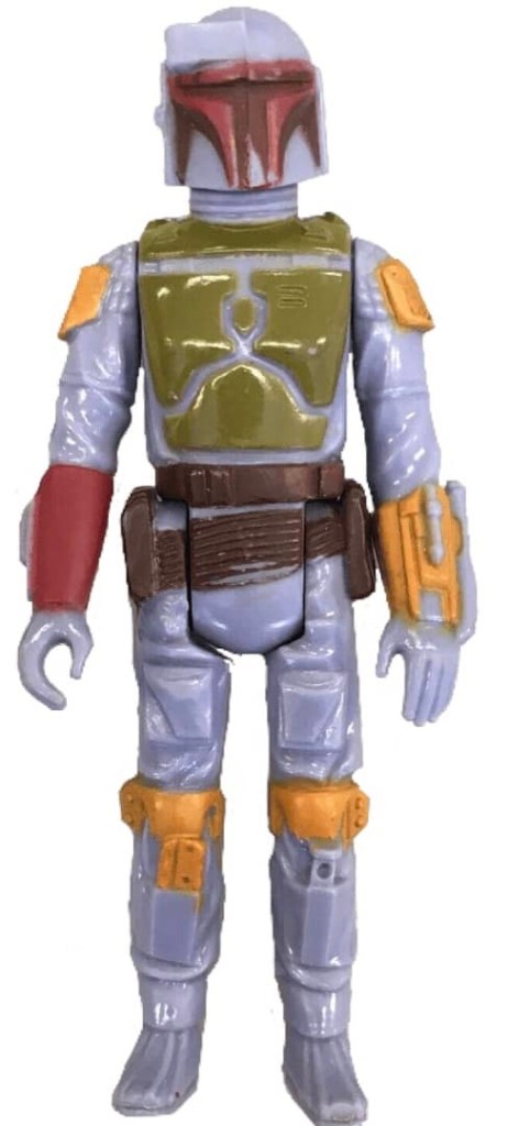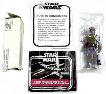 Notes: Boba Fett…….Just the name brings up all kinds of cool thoughts and images. Boba Fett was originally offered as a mail-order figure, which promised to be a Rocket Firing version with a shooting missile from his backpack. All this changed with an unfortunate incident involving the death of a child and a similar shooting missile from a Battlestar Galactica ship. So when the Boba Fett figures finally arrived, the missile was fixed and the firing mechanism had been removed. The carded issue had the same non-firing design. Despite the changes, a few rocket firing prototype Boba Fett figures did make it out to the hands of a select lucky few collectors, and do come to auction from time to time at MASSIVE prices.