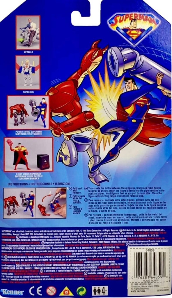 Notes: Power Swing Superman comes with a large “metal” pipe piece and a Blast-Apart Robot. Watch the robot blast to pieces when Superman swings the pipe at him.