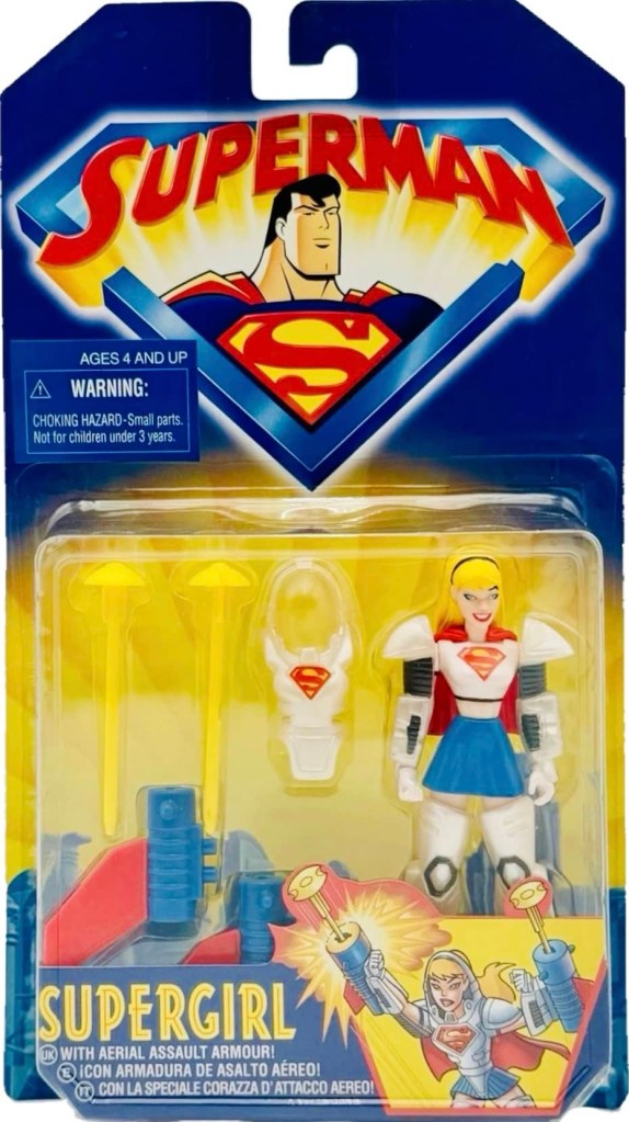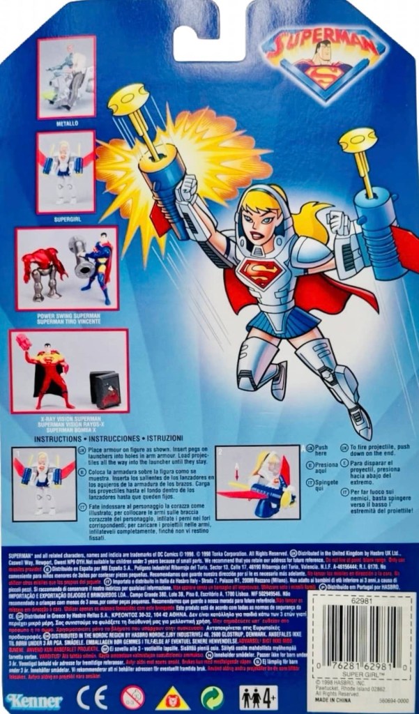 Notes: We finally get a Supergirl figure! She comes with her Aerial Assault Armor and two launchers with missiles. Snap on her armor and push the buttons for Supergirl to launch her missiles.