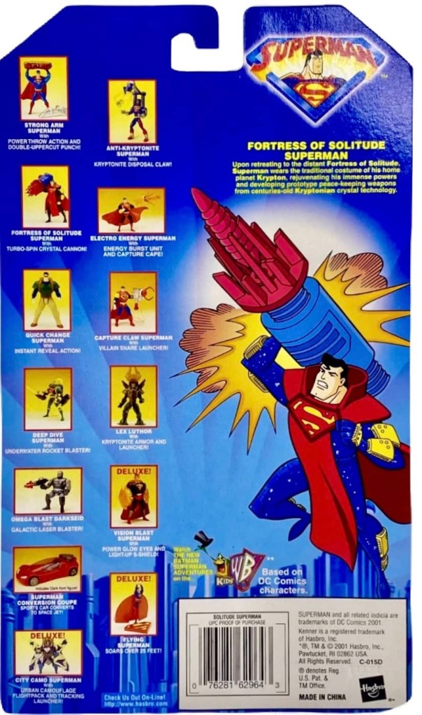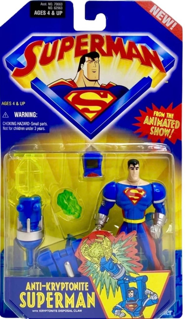The fourth and final wave of Superman Animated Series figures was a bit strange for a few reasons. The wave includes three new figures Anti-Kryptonite Superman, Fortress of Solitude Superman and Strong Arm Superman. they were initially supposed to be released in 1999 as European/Diamond Distributors exclusive, but got pushed back to 2001. This was mostly due to the Kenner/Hasbro merger and a lack of distribution outlets. This makes sense because the Animated Series actually came to an end the year prior in early 2000. These figures ended up being European exclusives only.