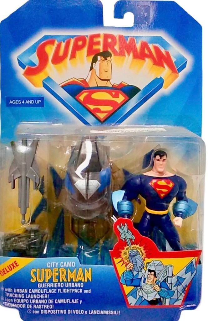 In addition to the many standard figures released by Kenner/Hasbro for the Superman Animated Series line, there were also six additional Deluxe figures as well. Included in this Deluxe series were: Vision Blast Superman, City Camo Superman, Flying Superman, Kryptonite Escape Superman, Ultra Shield Superman and Cyber Crunch Superman.