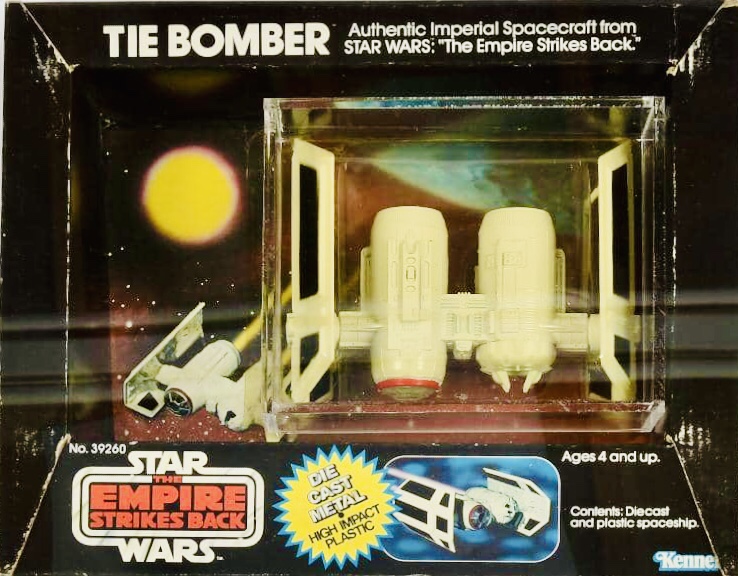 Notes: The Tie Bomber is the rarest Star Wars die-cast ship, and among the rarest items produced for the entire line. It was the last of the die-cast ships to be released in 1981, which resulted in low production numbers, making it hard to find back then and REALLY hard to find nowadays. It featured the break-away wings and a mini Stormtrooper figure that could be pulled out of the cockpit.
