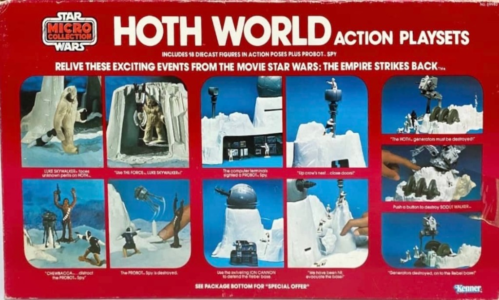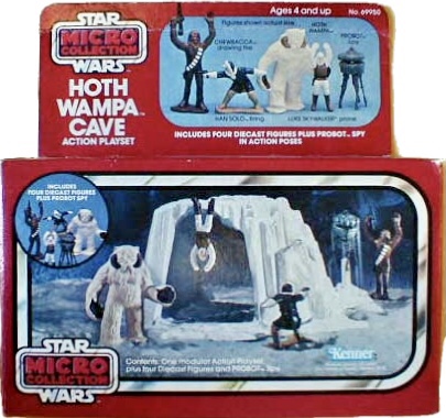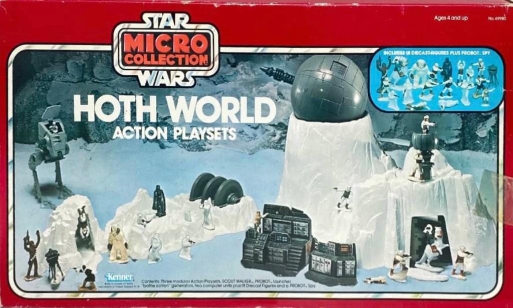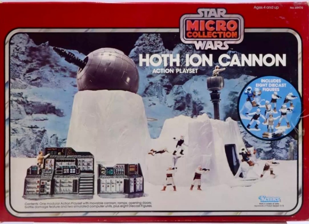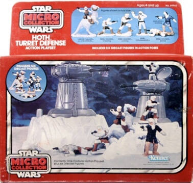 Kenner released their Micro Collection Die-Cast line in the Summer of 1982, and the Hoth sets were among the first issues. There were four different Hoth die-cast playsets (Hoth Generator Attack, Hoth Ion Cannon, Hoth turret Defense and Hoth Wampa cave), along with the Hoth World, which was a collection of three of the sets in one box (minus the Hoth Turret Defense set).