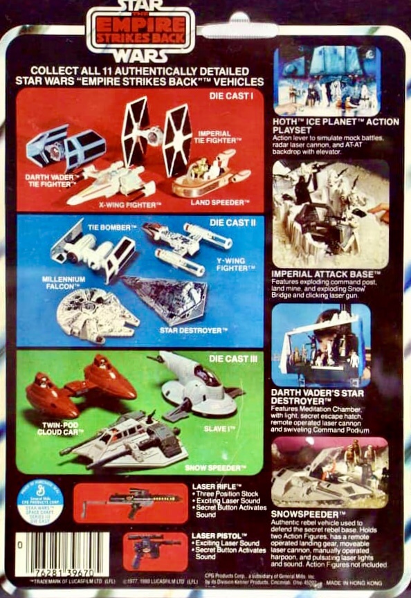 The third and final wave of Die-Cast ships included four more vehicles that were all seen in the new movie, The Empire Strikes Back. Included were the Rebel Snowspeeder, Slave 1, Twin-Pod Cloud Car and the elusive Tie Bomber.