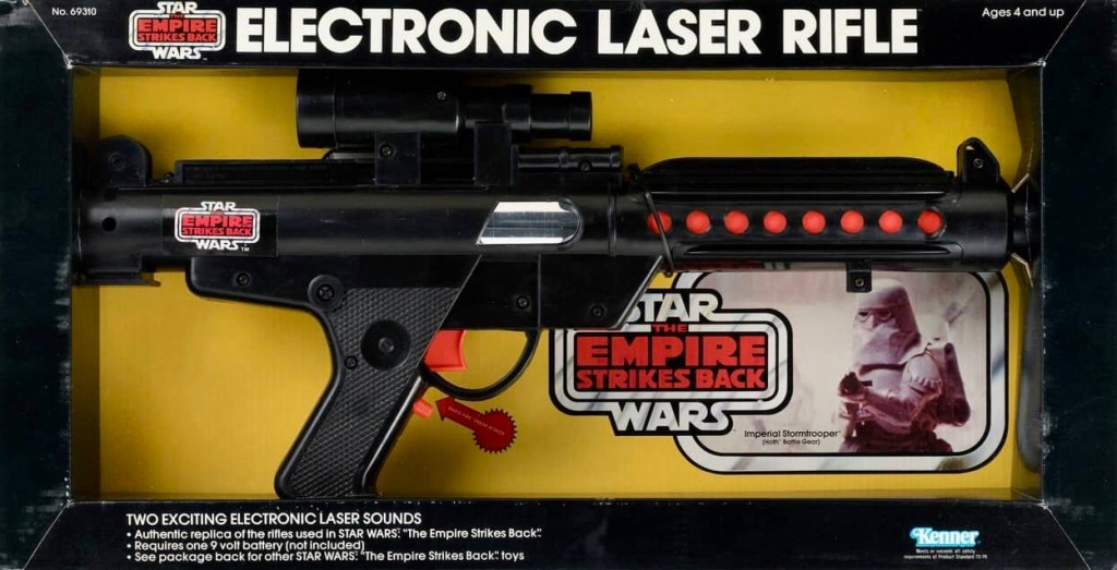 Kenner released some fantastic role play weapons as part of their Star Wars line through the years. The Empire Strikes Back line saw the Electronic Laser Rifle and Laser Pistol re-released with Empire Strikes Back packaging.
