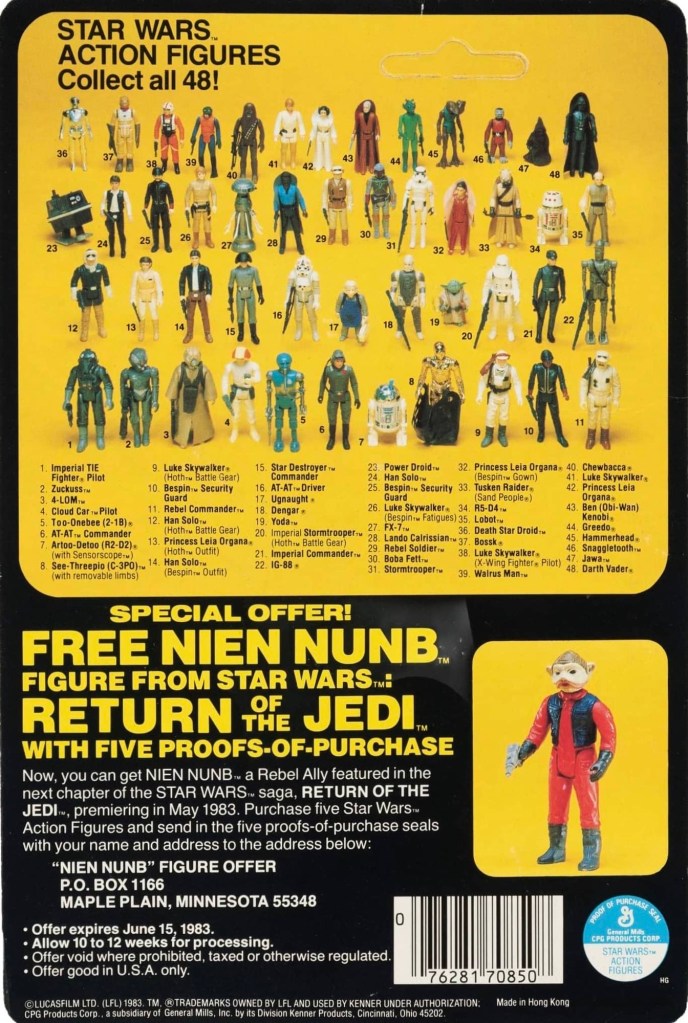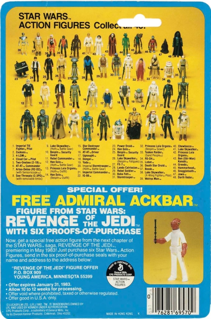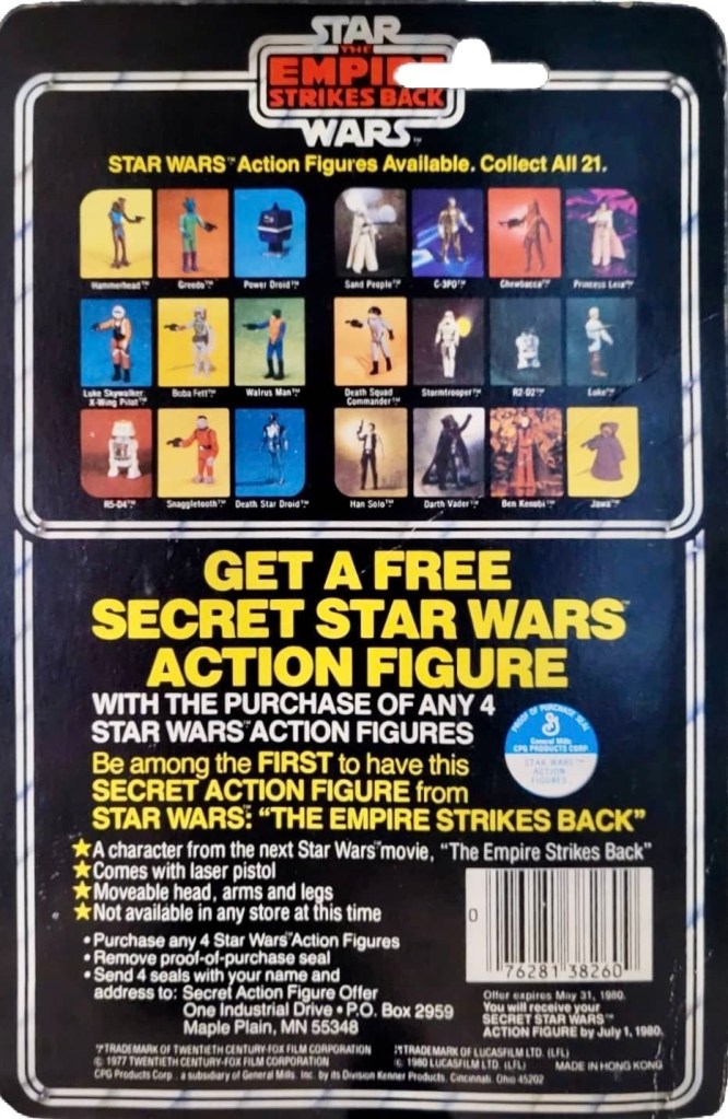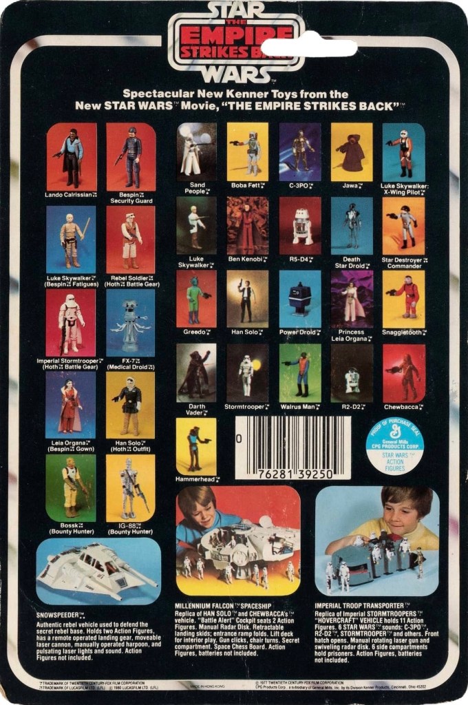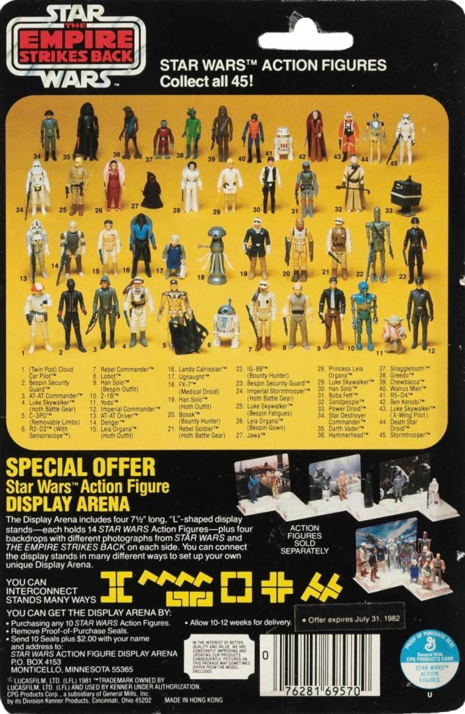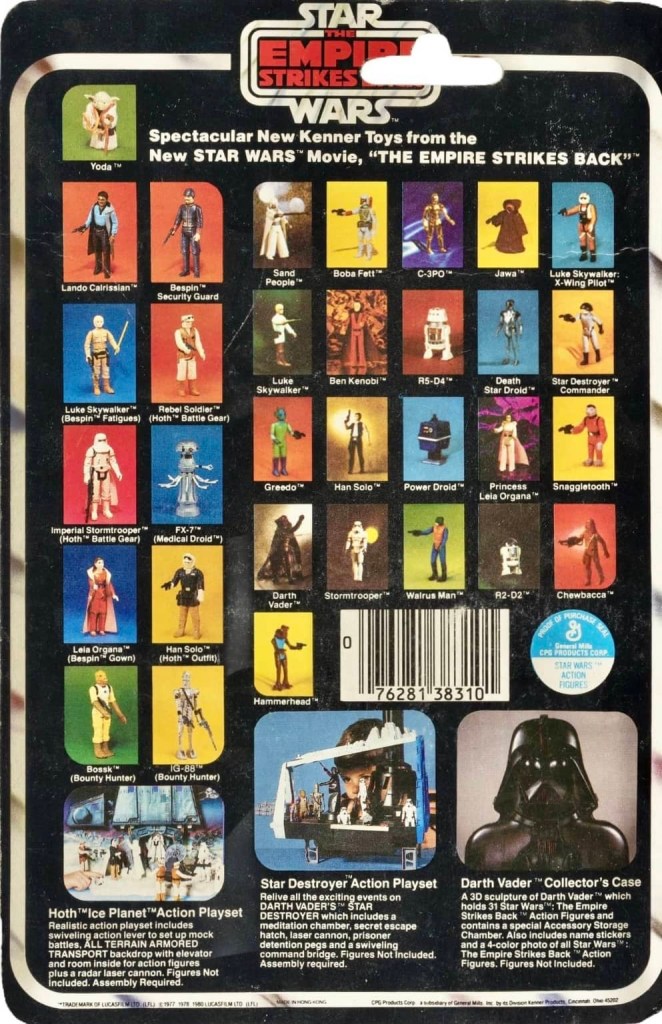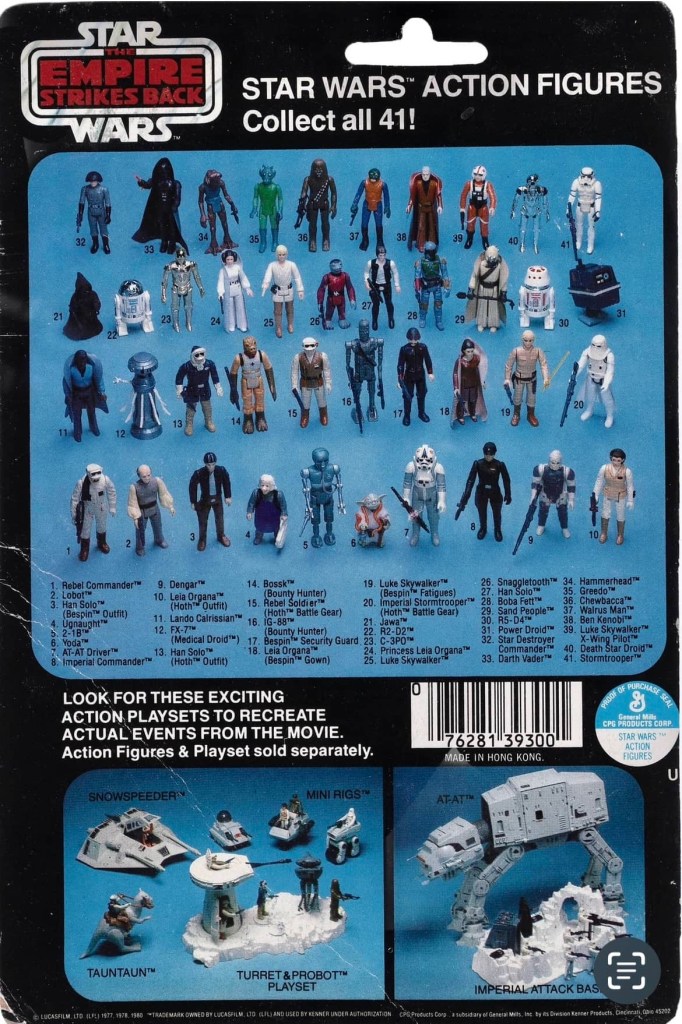The third and final wave of Empire Strikes Back figures contained 9 in total, which brought the total number of figures to 50, but due to a strange decision by Kenner to include R2-D2 and C-3PO on the back of the cards, the most figures displayed on the back of the cards were 48.