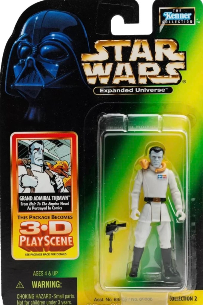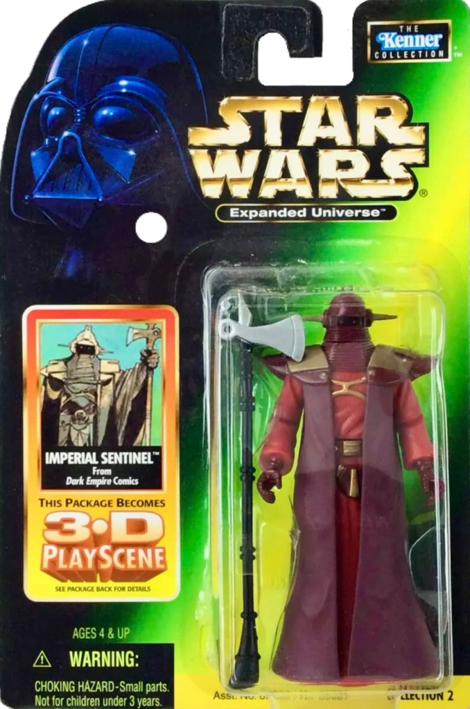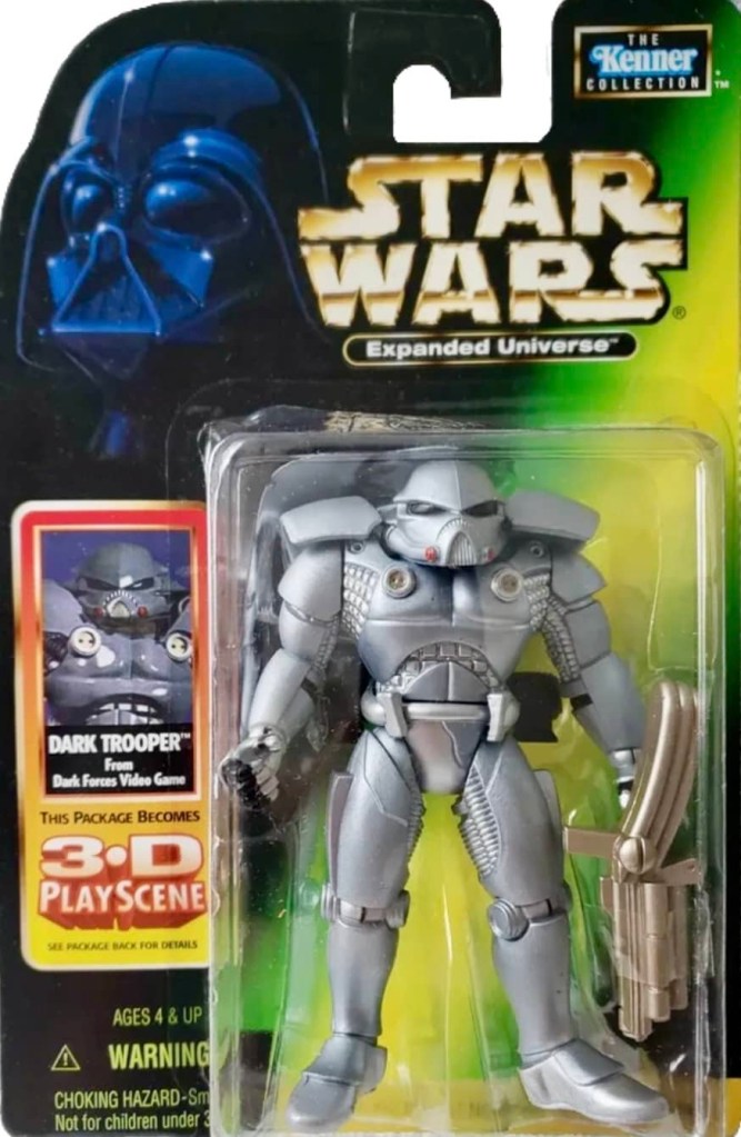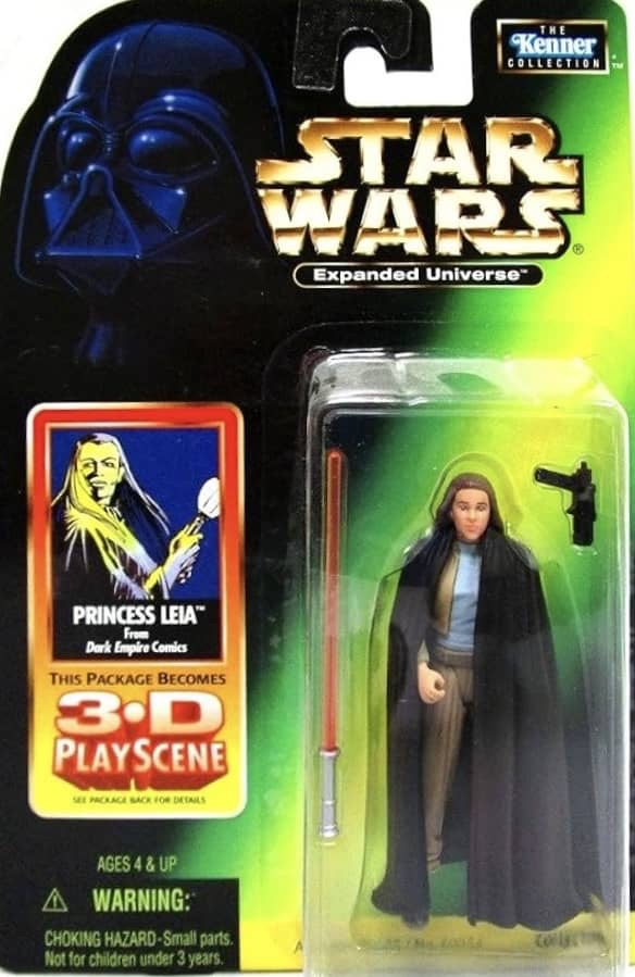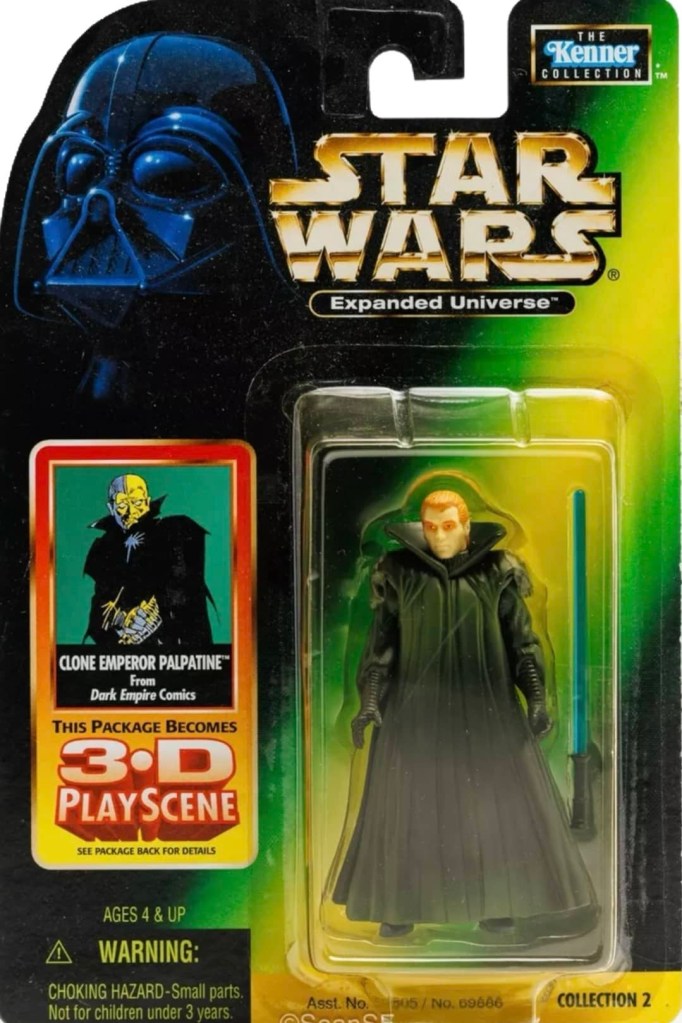 In 1998, Hasbro released a total of nine action figures based on the biggest stories of the Star Wars Expanded Universe at that time. Four of the figures were from the Dark Empire comic series by Dark Horse, three were from the Timothy Zahn written, Heir to the Empire novel and the other two were from the classic Dark Forces video game.