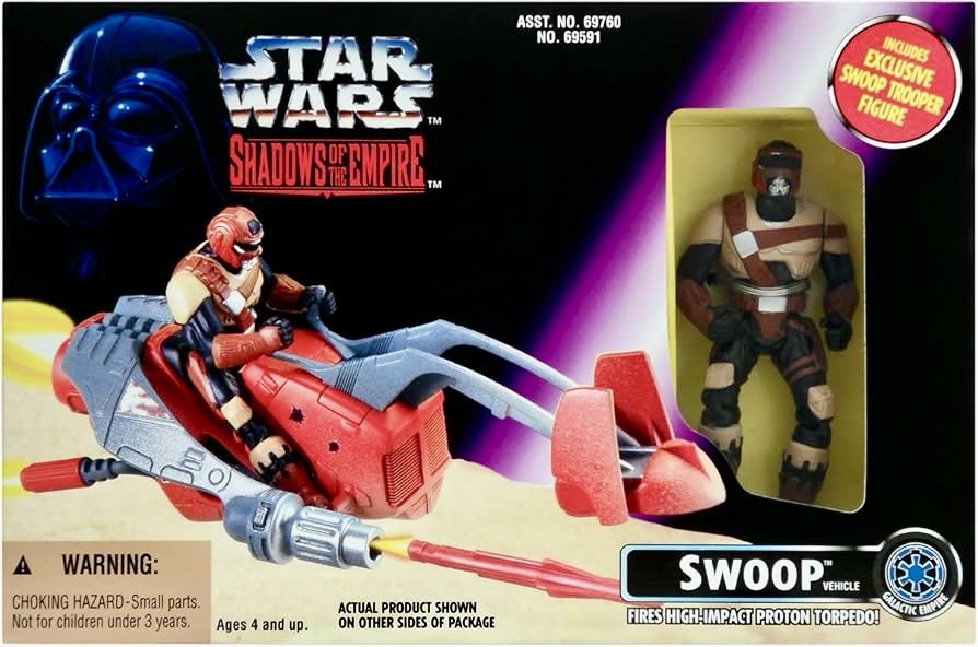 Hasbro released three vehicles for their Shadows of the Empire line in 1996 with all three being directly from the novel itself. Boba Fett’s Slave 1 was a re-issue from the Power of the Force line, but Dash Rendar’s Outrider and the Swoop Bike were fun new additions.