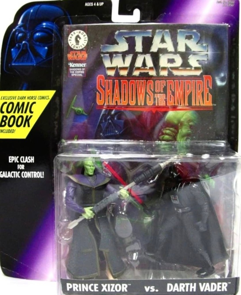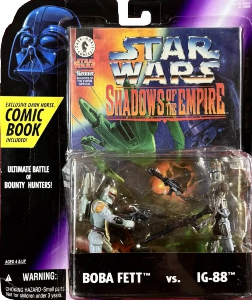 Hasbro released two different 2-packs for their Shadows of the Empire series, with one being a re-pack of previously released figures and the other was mixed. Darth Vader and Boba Fett had both been released with the Power of the Force line, while Prince Xizor was released individually with the Shadows of the Empire series. However, IG-88 was a brand new figure that could only be found with this two-pack.