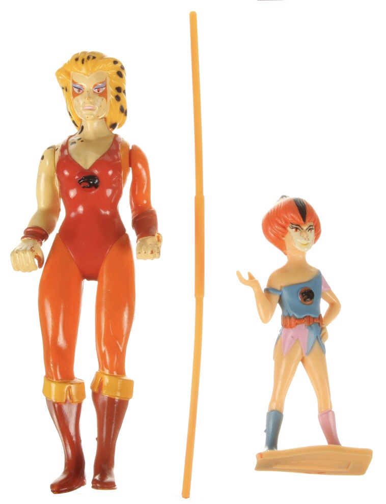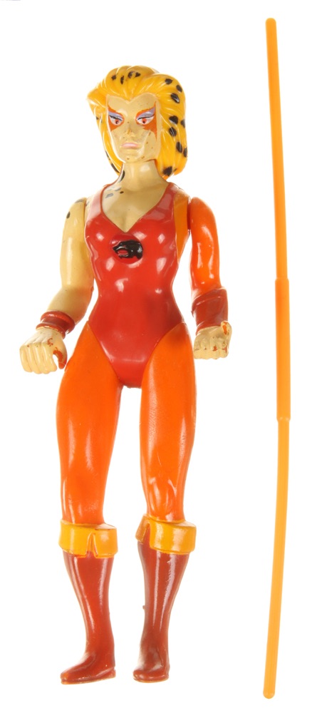 Notes: Cheetara was one of the original Thundercats team with her specialty weapon of choice being the Baton. She featured a special Battle-Matic Action lever on her back to move her arms. A second version of Cheetara with Wilykit came out later in the year, after the animated series had debuted. This version was nearly identical to the first issue.