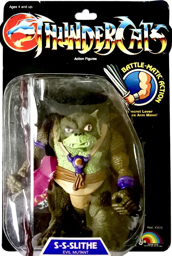 Notes: S-S-Slithe was another of Mumm-Ra’s henchmen that would wreak havoc on the Thundercats team . S-S-Slithe featured a special Battle-Matic Action lever on the back to move his arms. S-S-Slithe had two different head variations with one being made of a soft plastic with pink eyes and the more common one being a hard plastic material with the regular eyes.