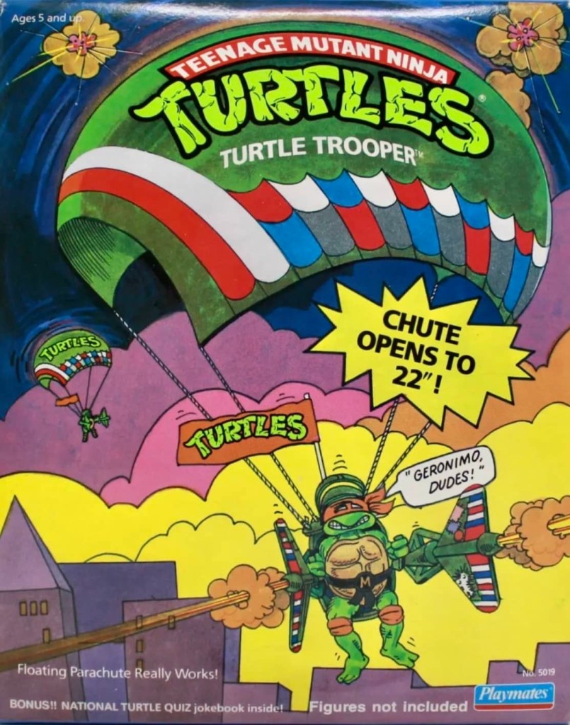 Notes: The Turtle Trooper was a parachute for the good guys that could actually open up to 22″ wide. All you needed was a turtle to strap the backpack onto and let it fly, or float. The fins could transform into anti-foot blasters.