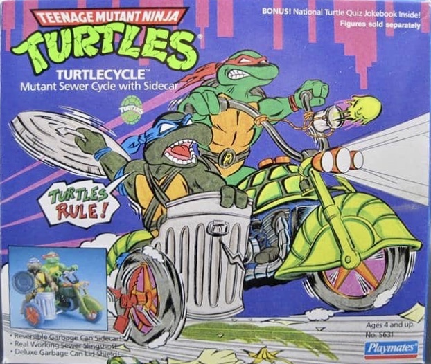 Notes: The Turtles needed a cool ride to get around the sewers, so why not give them a “Mutant Sewer Cycle with Sidecar”. The Turtlecycle had a working slingshot and reversible sidecar that could detach from the bike.
