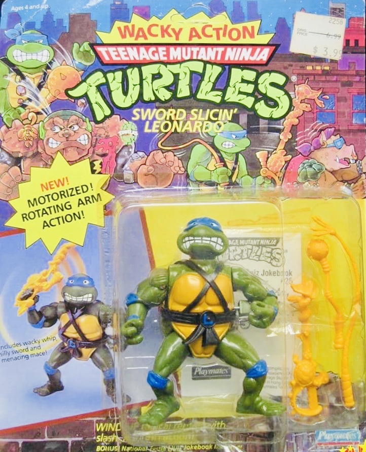 Notes: Leonardo finally gets his Wacky Action figure with this Sword Slicin’ version. He is part of the wacky action figure series and comes with a new rotating arm action that spins around when you wind up his power pack.