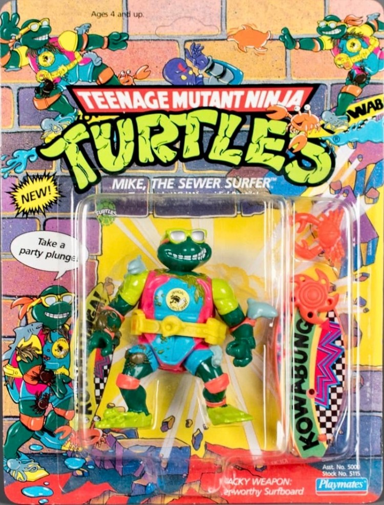 Notes: Described as a “Wet N’ Wild Wave-Ridin’ Reptile”, Michaelangelo goes full surfer dude status with his sewer surfer outfit. Complete with his trusty surfboard and friends, Mike is ready to catch some sewer waves.