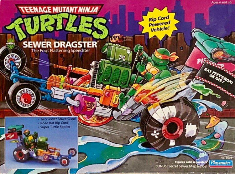 Notes: Part of the Pizza Powered Vehicle Line, the Sewer Dragster is the turtles newest cool looking ride . This speedster would take off when you ran the rip cord through the flywheel on the bottom.