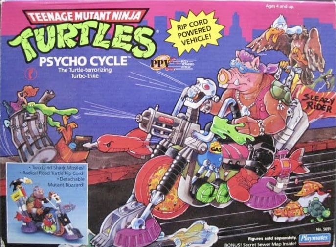 Notes: Part of the Pizza Powered Vehicle Line, The Psycho Cycle is described as “The Turtle Terrorizing Turbo Trike”. It’s truly the coolest way for the Foot Clan thugs to get around town and chase down the turtles.