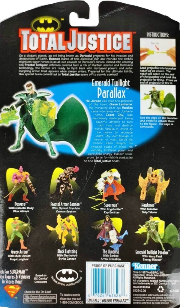 Notes: Hal Jordan is best known for being the Green Lantern, but was once known as Parallax in the Total Justice storyline. Hal went a little cuckoo and wiped out the Green Lantern Corps and absorbing all the energy from the main power battery on Oa. Parallax is one of my favorites from this line because of its great detail and fantastic accessories. He comes with a Warp Field Energy Blaster w/ a projectile, Energy Shield and a removable cape.