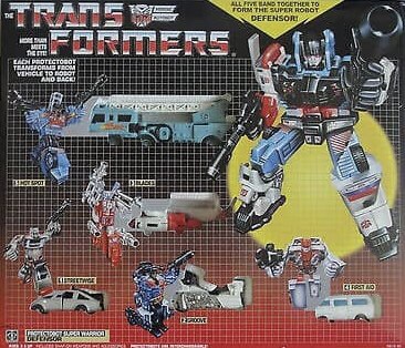 Notes: Defensor is the large robot, made up from all five of the Protectobot figures. This gift set featured all five figures in one box.